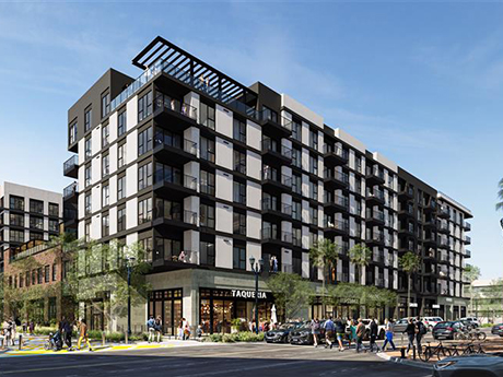 LONG BEACH, CALIF. — JPI has broken ground on Portico, a 272-unit project with 18,841 square feet of ground-level retail. The $150 million development marks Phase I of a master plan for Mosaic, which is the redevelopment of the former City Place Long Beach shopping center. Completion of the eight-story building is slated for June 2028. City Place Long Beach was developed in the 1990s on about 14 acres in downtown Long Beach. The site was cleared earlier this year. Units will be offered as studios through three-bedroom floor plans with amenities that include a speakeasy, a rooftop deck, a golf simulator, fitness center, a sauna and a pool deck overlooking the Mosaic shopping center. Finance partners include Tokyo Tatemono and BMO Bank. The broader Mosaic project, led by Turnbridge Equities, Waterford Property Co. and Monument Square Investment Group, will ultimately deliver 900 multifamily residences and 38,000 square feet of commercial space.